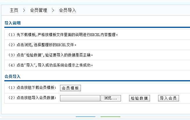 會員導入功能說明:注意事項:請詳細閱讀,會員導入的注意事項說明操作流程: 1.點擊會員模板: 下載會員導入的模板 2.按照模板要求: 將需要導入的會員信息錄入表格中并保存 3.點擊瀏覽 : 在系統彈出對話框后,找到上一步保存的表格文件 4.點擊檢驗數據: 系統會自動校驗錄入的數據是否符合規范 5.點擊導入會員: 系統將符合規范的數據 導入系統 6.導入成功 會員模板------>錄入數據------>點擊瀏覽------>檢驗數據------>導入會員------>導入成功
